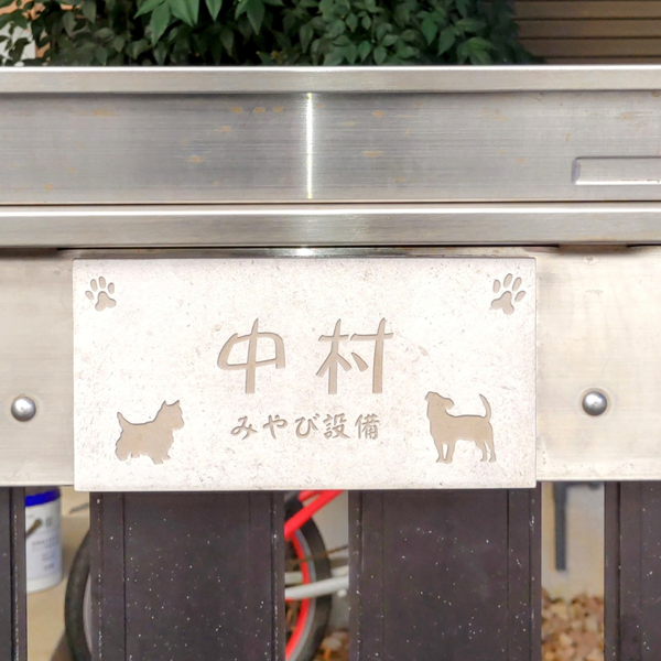 無事に取り付けました!写真添付しますので、サイト等、良かったら使ってください。雨垂れがきたないですが…今回は、既存の表札が劣化で割れてしまい、発注させていただきました。事業を立ち上げたので、屋号も表札に載せたかったので、ちょうど良いタイミングでした。ありがとうございました!