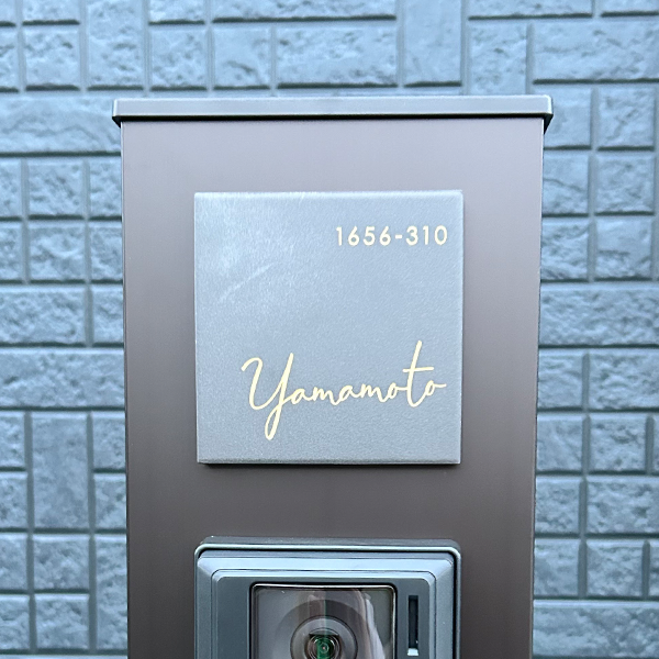新築に伴い注文させて頂きました。我が家は特注サイズW300mm(+3000円)番地プレートMサイズ(+5500円)マットゴールドは思ったよりゴールドではなかったですがいい感じです♪番地プレートは写真の通りインターホン下に取り付けました。耐久性はまだ分かりませんが大変満足のいく商品です。参考までに名字6文字、上記オプション、クーポン(-2000円)で23300円でした。