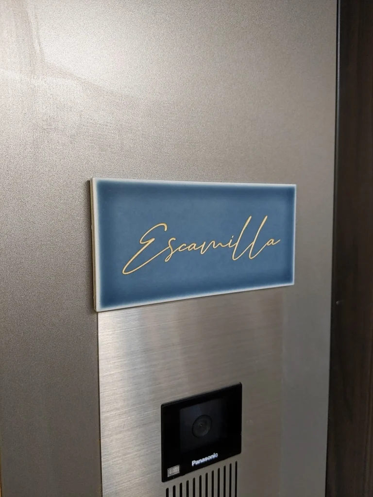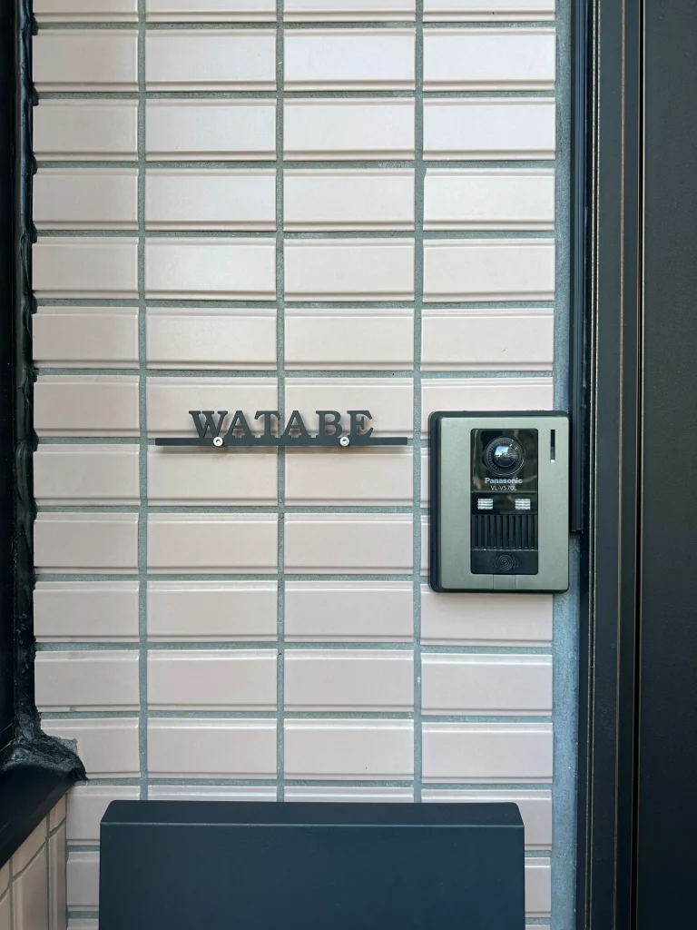 タイル表札。新築当初は表札なしでいいかとつけておりませんでしたが、やはり表札がないと不便だと感じ、注文させていただきました。後付けのため配置が難しく、バランスも良いとは言えませんが、表札自体は気に入っています。デザイン案も2パターン出していただいたり、その後のやりとりも丁寧に対応してくださいました。自身で取り付けましたが、マスキングテープや養生テープでの目印や仮押さえは悩むところもあり、2時間ほどかかりました。スペーサー追加、ボルトなし、両面テープと接着剤で貼り付けのため、やや不安はありますが、取れてこなければといいなと思います。